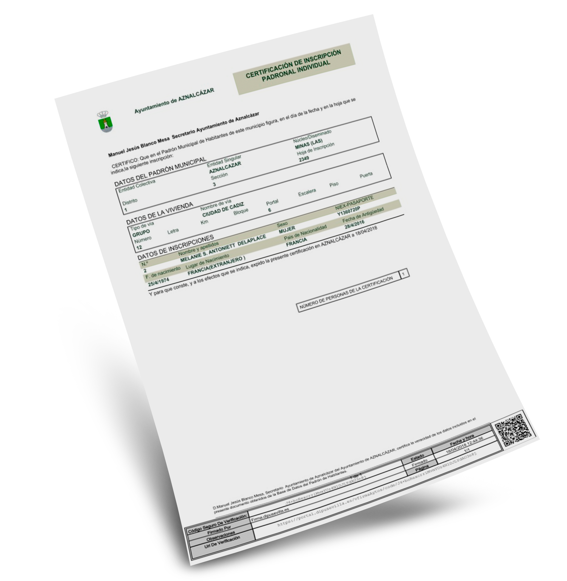 Acredita el empadronamiento ante Tribunales de Justicia, organismos extranjeros, etc. Las certificaciones llevan las firmas manuscritas del Secretario y el Alcalde (o delegados).