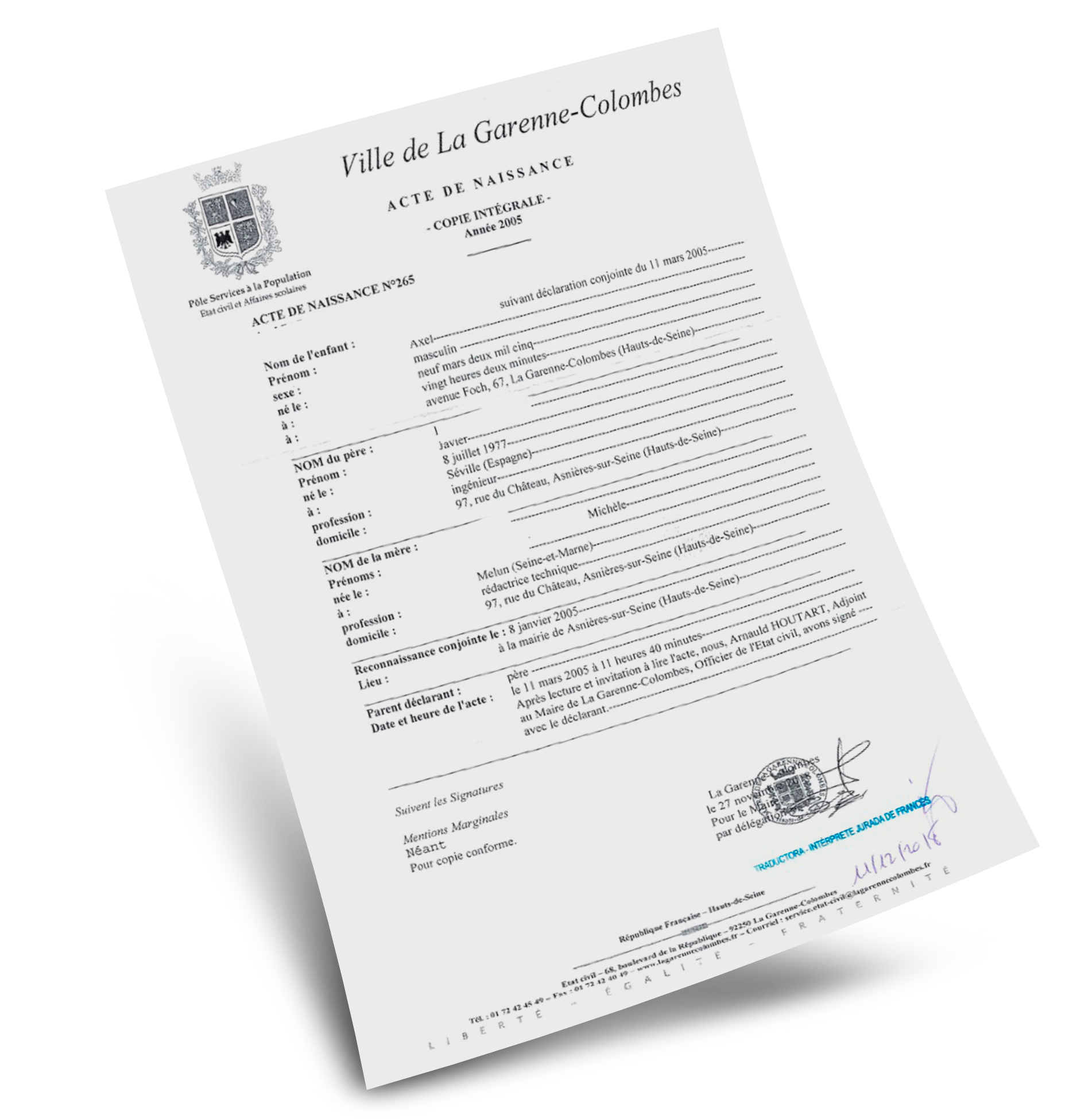 - Te pedirán una Traducción Jurada de tu Certificado de Nacimiento al español en caso de que el tuyo esté escrito en inglés, francés, italiano, alemán, etc. ya sea por haber nacido allí o ser de esa nacionalidad, ya que en España se exige que todo documento oficial esté redactado perfectamente en castellano. Del mismo modo ocurre en caso de que seas español y viajes al extranjero, deberás realizar estos trámites para que sea válido en caso de que quieras trabajar, vivir, separarte, etc.